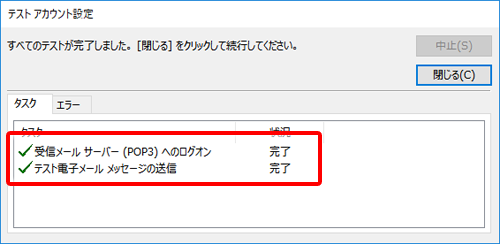 送受信共に、状況が「完了」したことを確認し[閉じる]をクリックします。