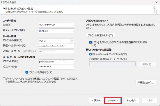 メール設定情報に記載の“アカウント”と“パスワード”を入力