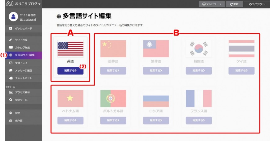 (!)ご注意ください おりこうブログAI多言語変換オプションは、有償オプションです。 ご利用希望の際は、機能追加のお申し込みが必要となります。また、申し込みいただいた言語のみの変換機能となります。詳しくは弊社カスタマーセンターへお問い合わせください。 |