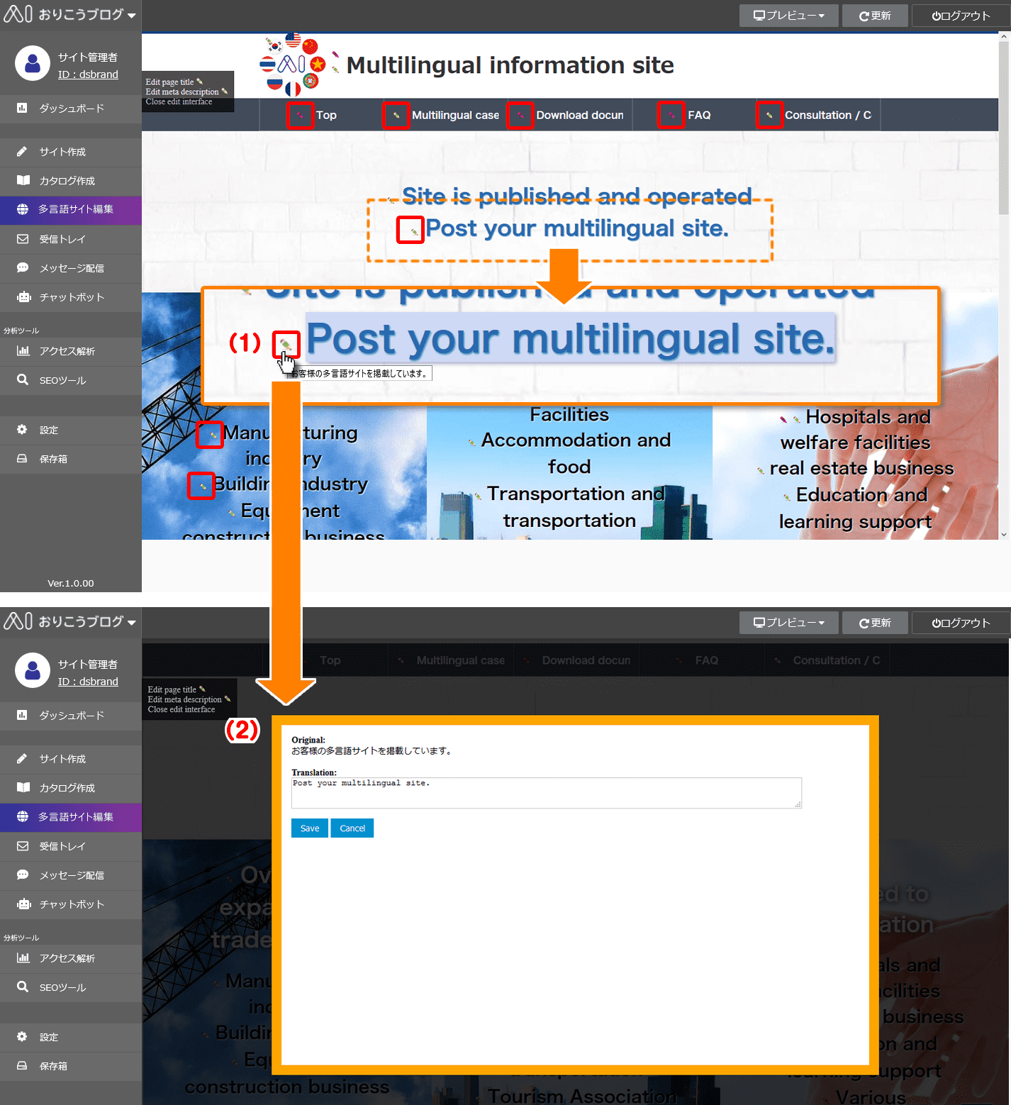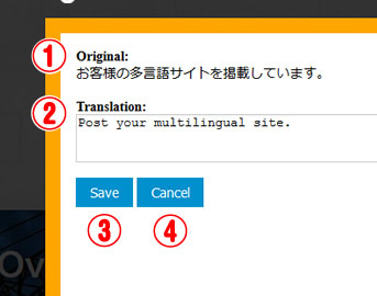 - 人翻訳を消したい場合は、自動翻訳の結果を消して「Save」をクリックします。保存が完了後、ページを再度読み込むと自動翻訳が表示されます。
