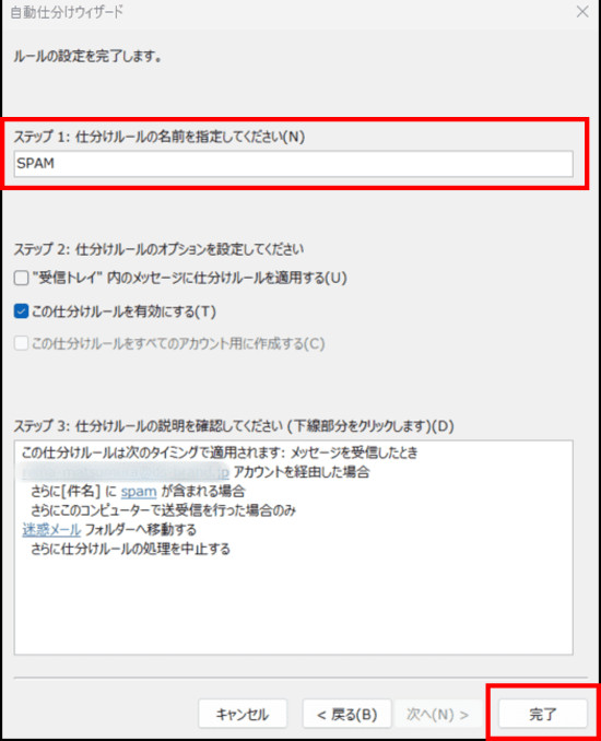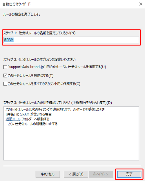 10.仕分けルールの名前を任意で入力し、[完了]をクリックします。