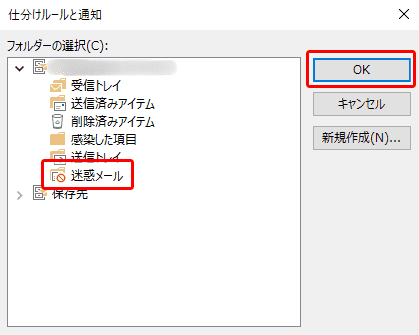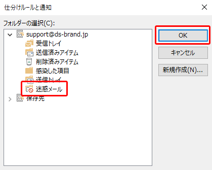 6.フォルダーの選択より、SPAMメールを移動したいフォルダを選択し、[OK]をクリッ