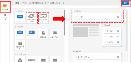 [パーツ配置]をクリックし、[キャッチビジュアル]または[ヒーローヘッダー]をドラッグしてトップエリアの領域へ移動し、[保存]してください。