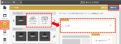 [キャッチビジュアル]または[ヒーローヘッダー]をドラッグしてトップエリアの領域へ移動し、[適用する]をクリックしてください。