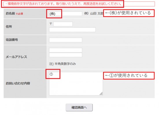 お問い合わせフォームに入力いただいた内容の中に、「環境依存文字」が含まれていることが原因です。