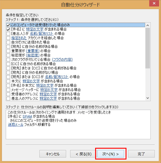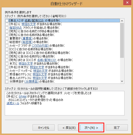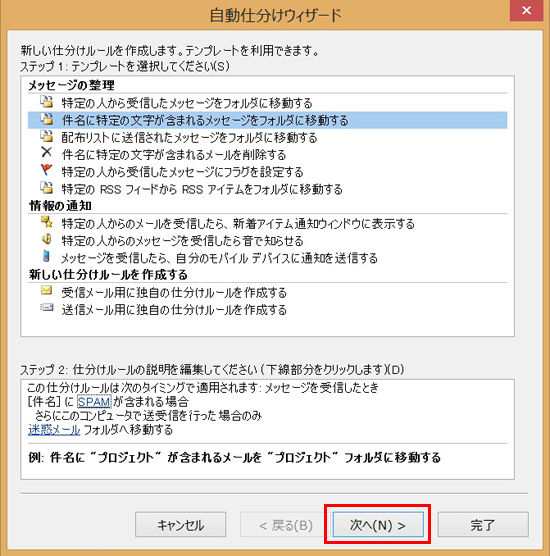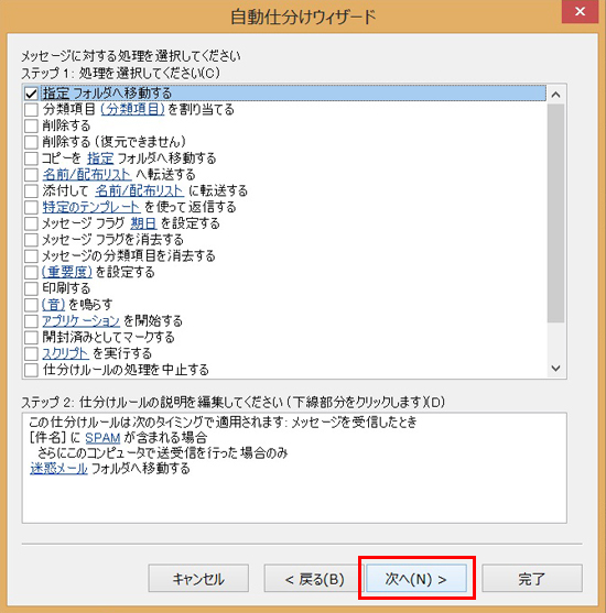 7.「自動仕分けウィザード」に戻ったら、「次へ」をクリックします。