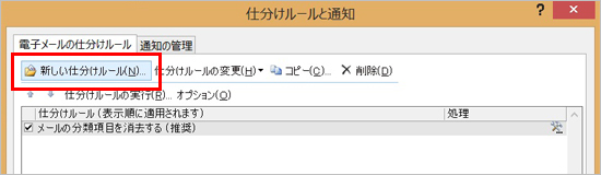 2.「仕分けルールと通知」ウィンドウが表示されますので、「電子メールの仕分けルー