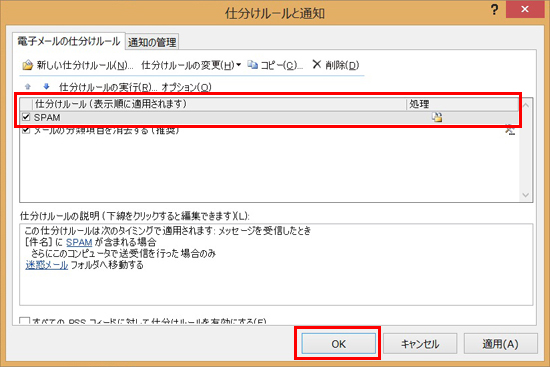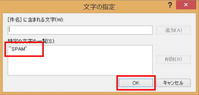 (2)「特定の文字の一覧」に “SPAM” が追加されたことを確認し、[OK]をクリック