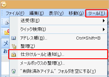 1.Microsoft Outlook 2007を起動し、[ツール]>[仕分けルールと通知]を選択します。