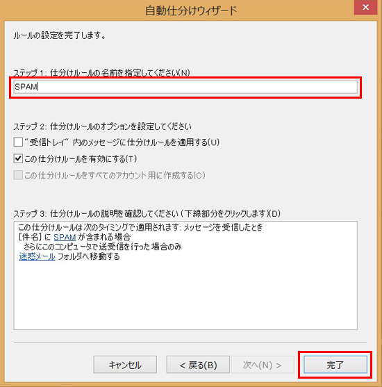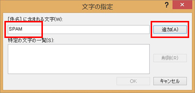 (1)「[件名]に含まれる文字」欄に、“SPAM” と入力し、[追加]ボタンをクリック