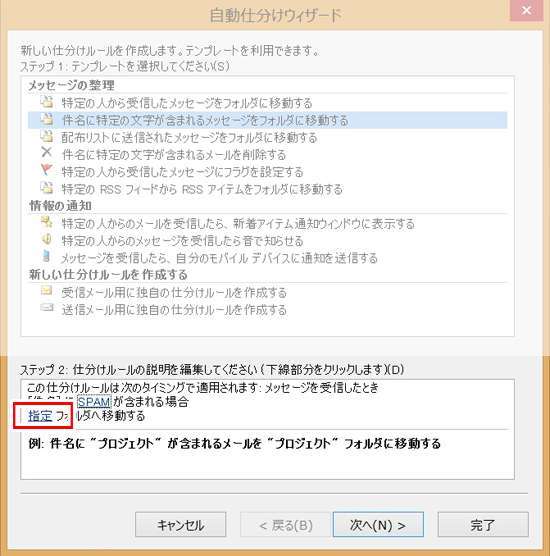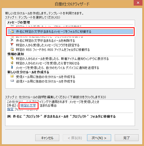 「件名に特定の文字が含まれるメッセージをフォルダに移動する」を選択