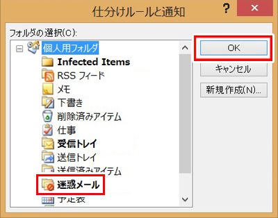 6.フォルダの選択より、SPAMメールを移動したいフォルダを選択し、[OK]をクリック