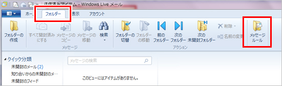1.「フォルダー」タブを開き、「メッセージルール」をクリックします。