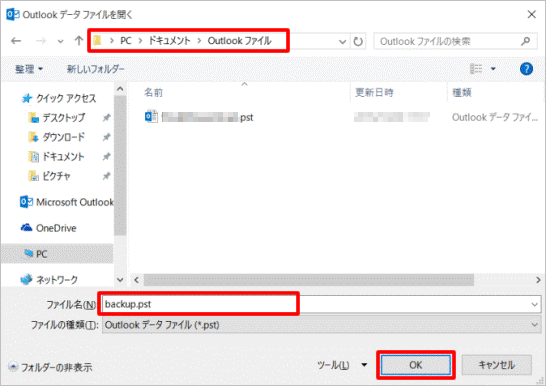 ※初期設定では、「ドキュメント」の「Outlookファイル」フォルダー内に、「backup」という