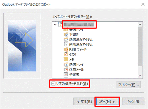 5.「エクスポートするフォルダー」欄から該当のフォルダーを選択し、「サブフォル