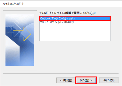 ファイル(.pst)」を選択し、「次へ」をクリックします。