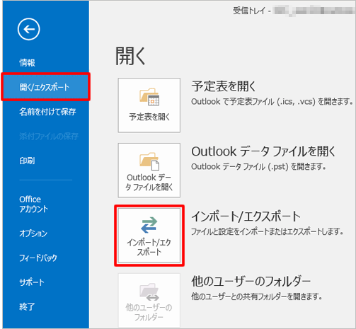 ●Outlook2010:[ファイル] > [開く] > [インポート] の後、手順3へ