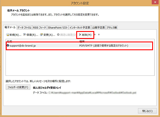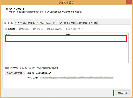 4.対象のメールアカウントが削除されたことを確認し、「閉じる」をクリックします。